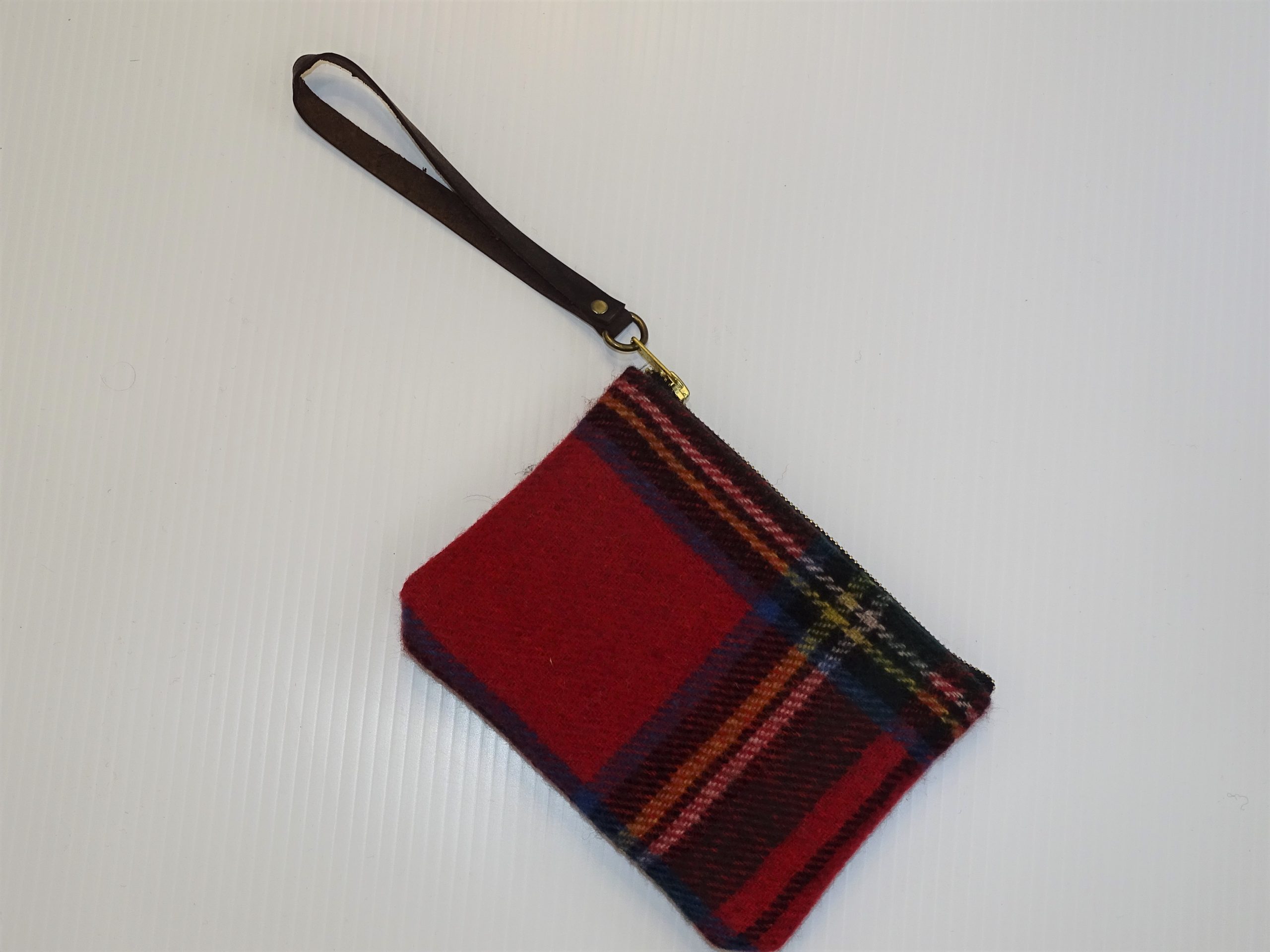 Hannah Royal Stewart tartan clutch, YKK zipper, leather wrist strap. inside pocket