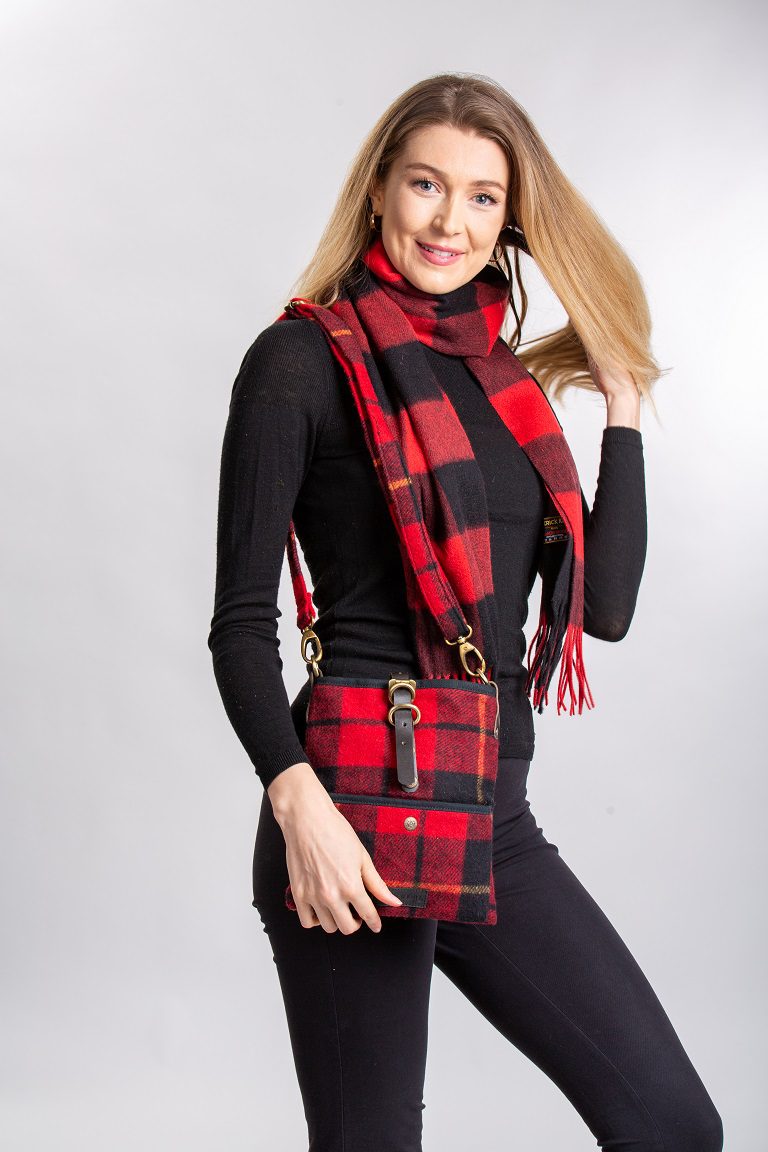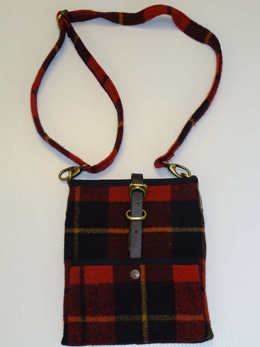 Islay deluxe wool tartan cross body bag, strap all wool, deluxe brass hardware, inside pocket, front snap pocket for cell phone, magnetic snap closure.