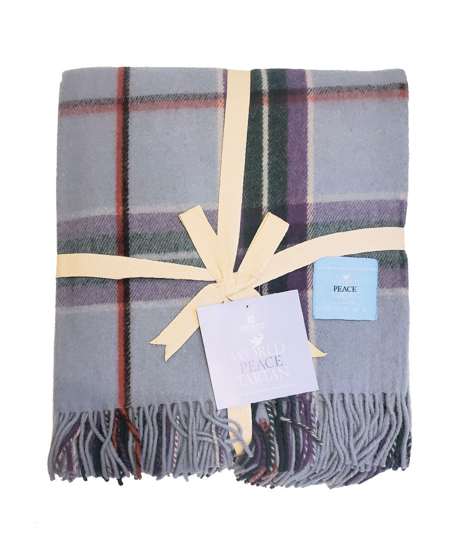The World Peace Tartan was created in Scotland to promote the message of World Peace. Scotland is symbolized by the purple and green of the Scottish thistle. The red and black are reminders of the realities of war and violence and the need for a new culture of non-violence. The white running through the pattern provides a counterbalance of peace and light. The light blue represents the presence, hope and potential of the United Nations.